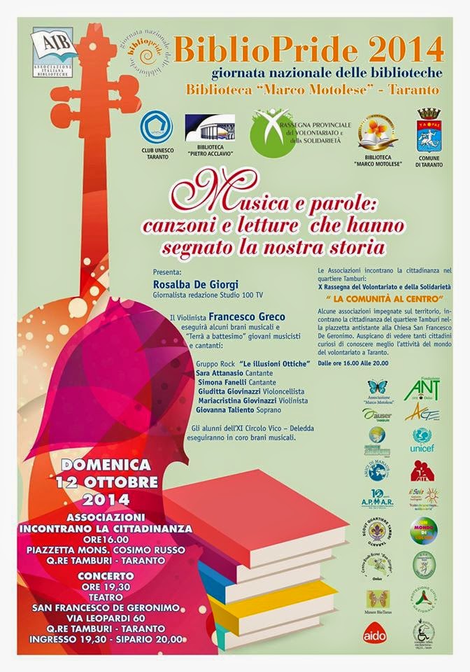 Domani,12 ottobre, alle 16.00 associazioni di volontariato in mostra in Piazzetta Monsignor C. Russo, ed alle 18,30/ 19.00 tutti nel Teatro San Francesco de Geronimo (quartiere Tamburi, Taranto) ad ascoltare un concerto.